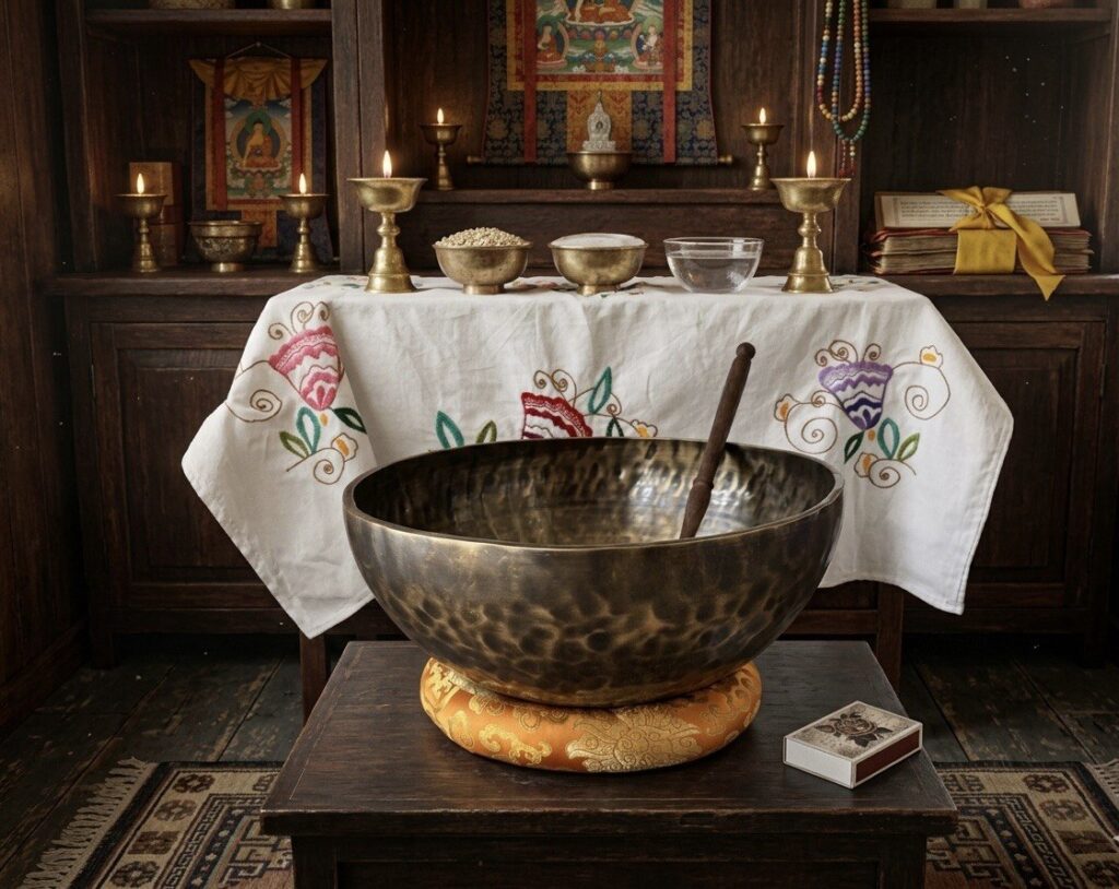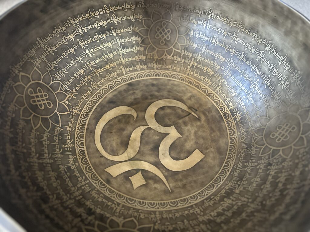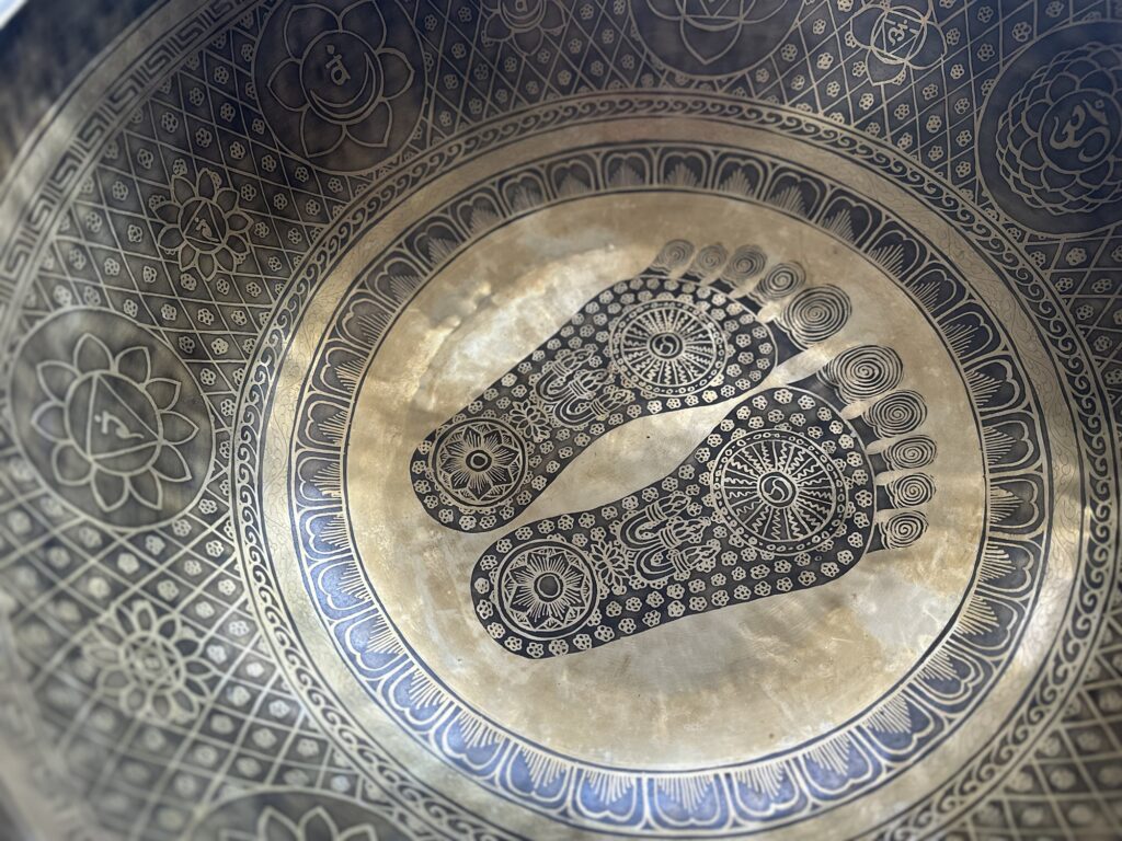 Kausil on sees ja väljas erinevad muljetavaldavad ja rikkalikud Tiibeti sümboolikad. Kausi põhjas kaks jalajälge. Neid nimetatakse Buddha jalajälgedeks, tegelikkuses võib kausi sisse teraapia ajal paljajalu sisse astuda  (täiskasvanu) või ka väiksema lapse sisse istuma tõsta, et võnked rakutasandil kehast läbi läheksid. Meie keha koosneb suures osas veest ja just selle pärast heliteraapia meie kehale niivõrd avardavalt mõjubki.